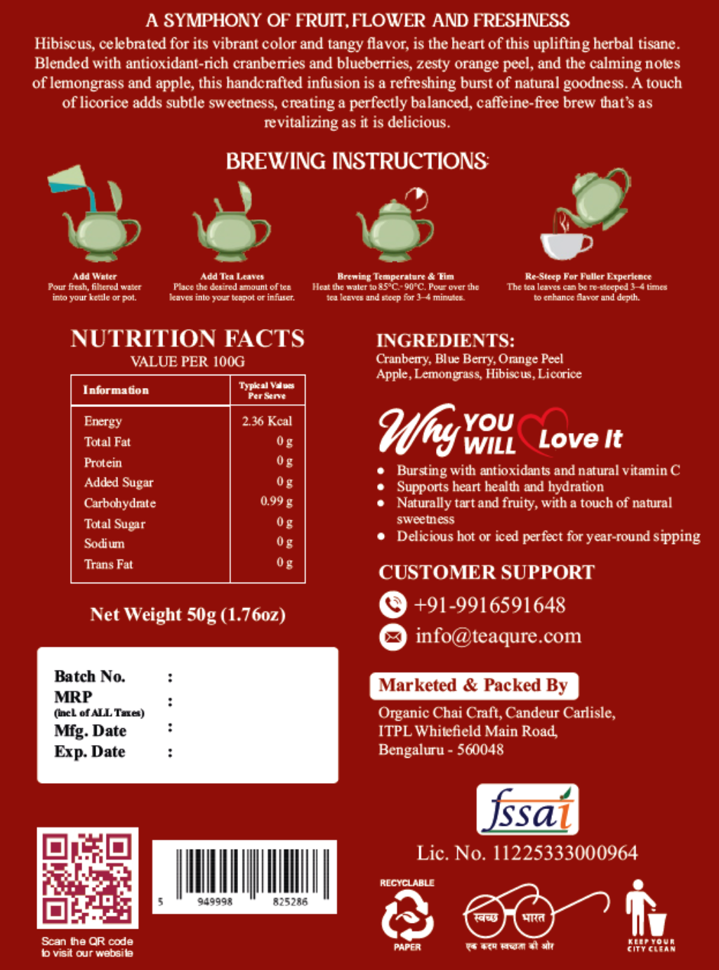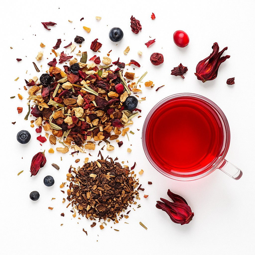 Cranberry, Blue Berry, Orange Peel, Apple, Lemongrass, Hibiscus, Licorice